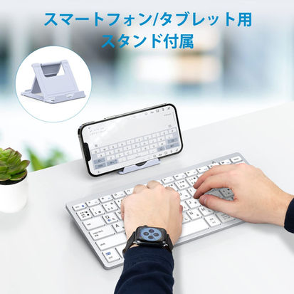 スマートフォン・タブレット兼用のスタンドが付属しています。タブレットを立てかければ、まるでノートパソコンのように作業することができます。