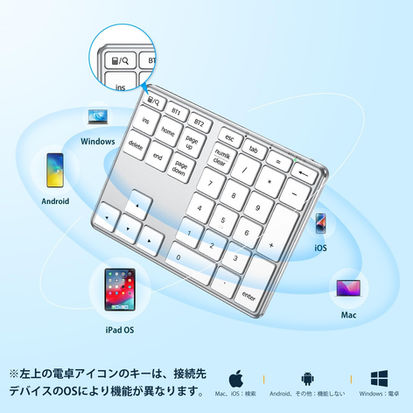 ◆接続先デバイスがWindows/Androidの場合は、テンキーは接続先デバイスのNumlockに連動する連動型となります。Mac/iOSデバイスと接続する場合のみ、テンキーは非連動型となります。Windows/AndroidのテンキーレスPCをご使用の際は、一部がNumlockと連動するため(例:Uキーを押すと4が入力される、など)、予めご注意ください。